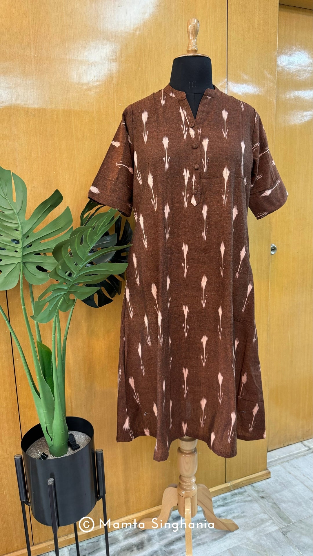 A-line kurti with short sleeves. Detailed with hand-made fabric buttons, these ready-to-wear pieces are very comfortable for daily use.