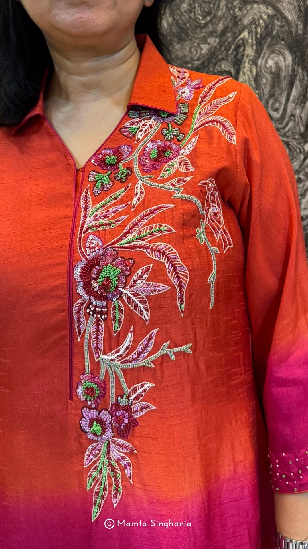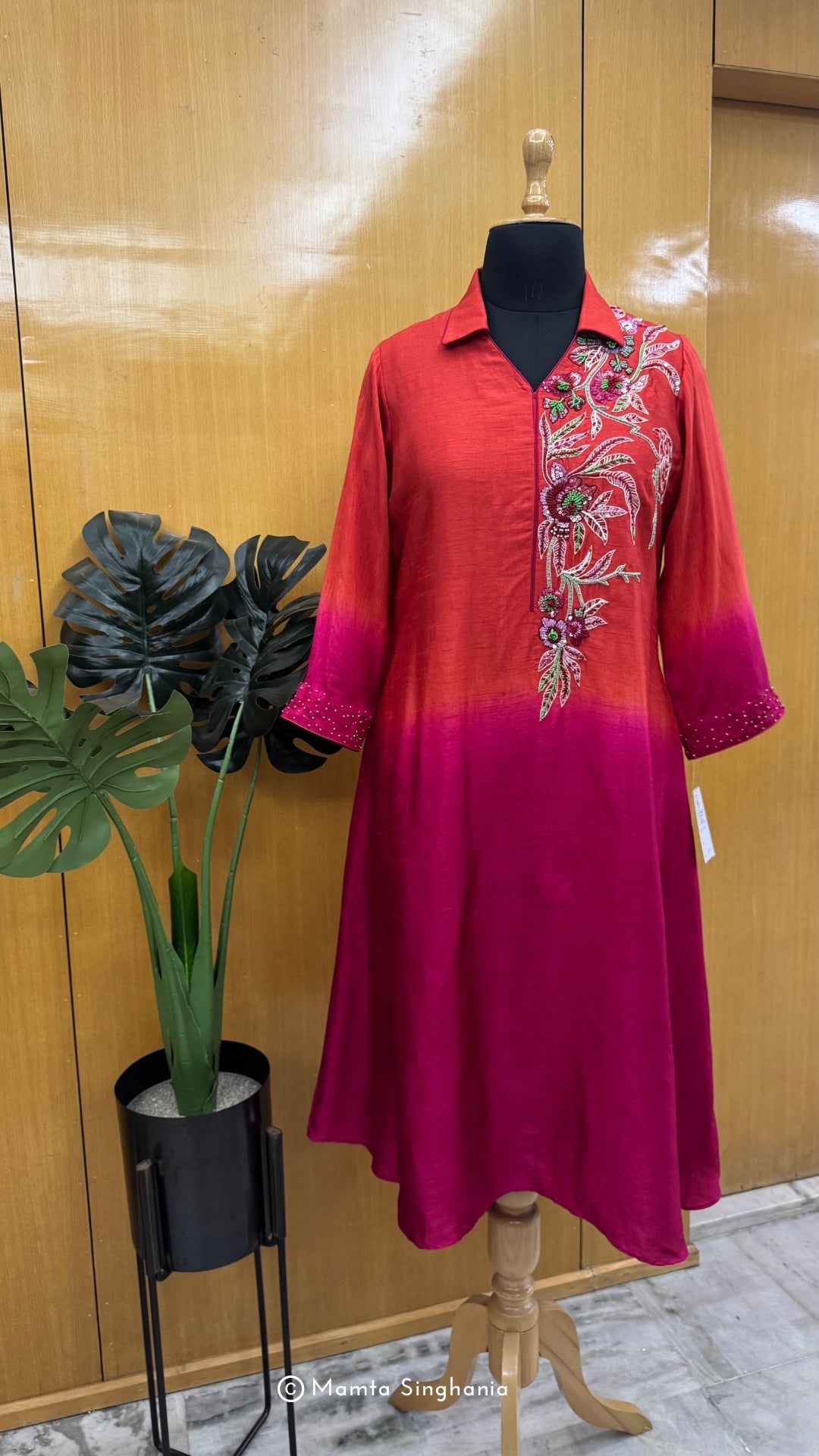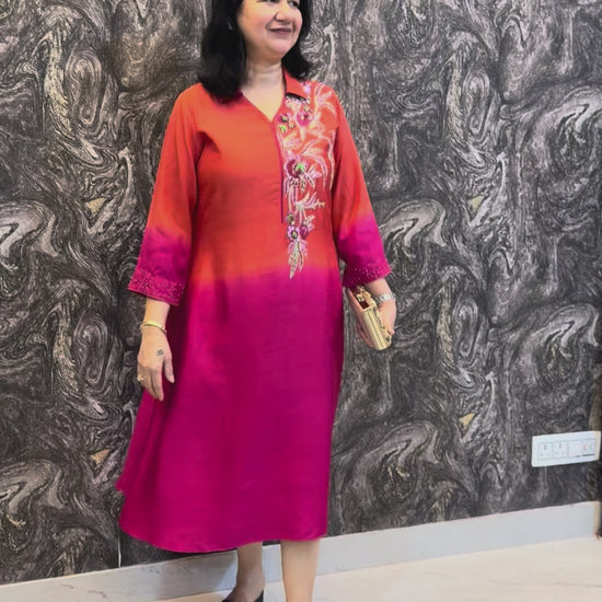 Shaded rust red and pink A-line dress with intricate embroidery in the front and sleeves.