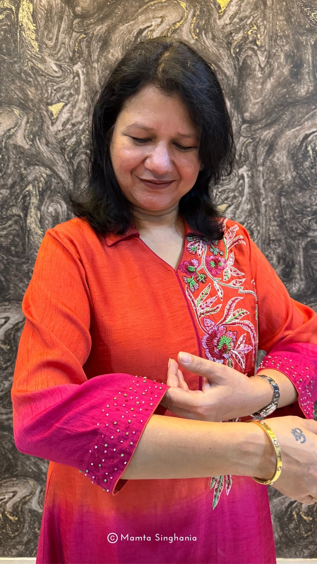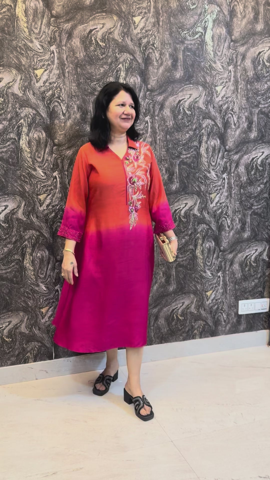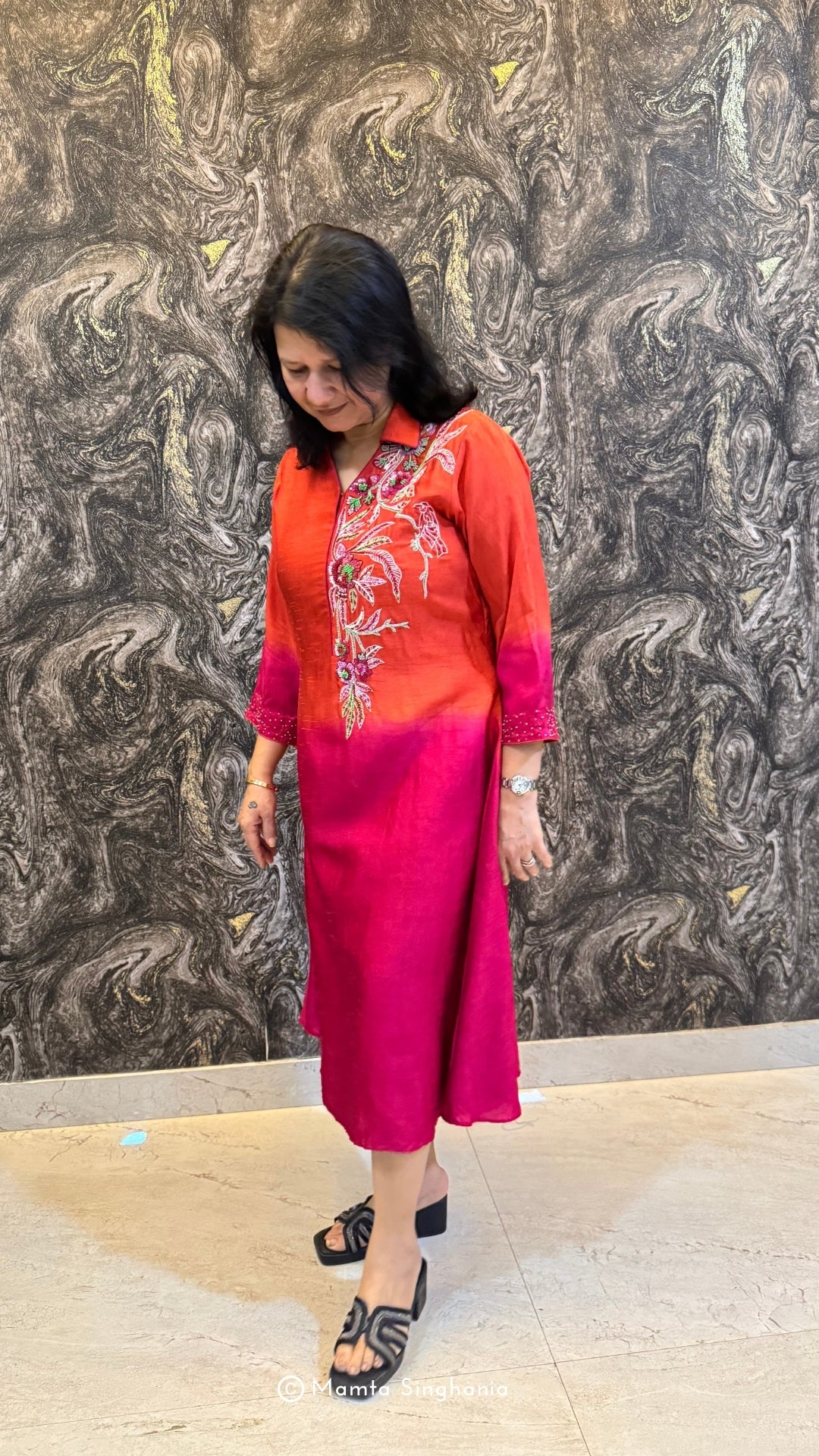 Shaded rust red and pink A-line dress with intricate embroidery in the front and sleeves.