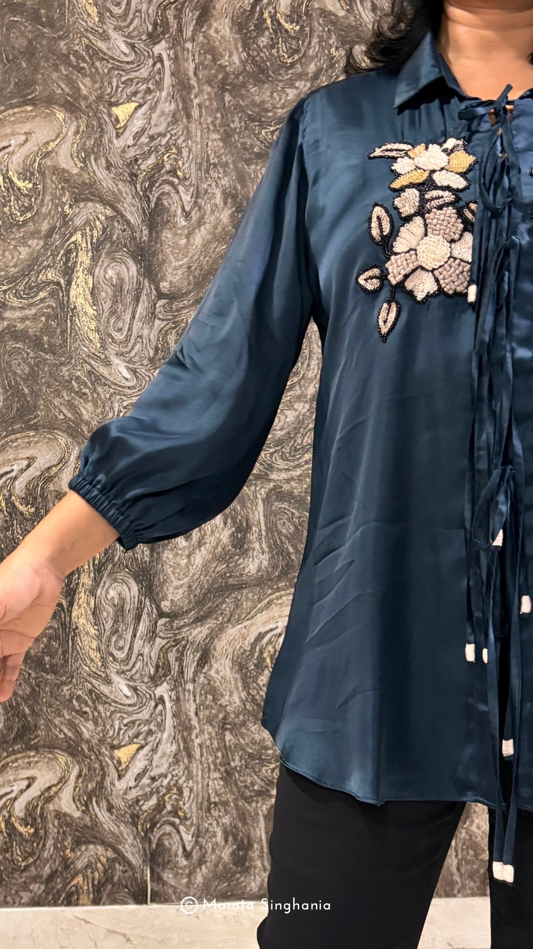 Midnight blue top with intricate sequence embroidery and tie-up details.