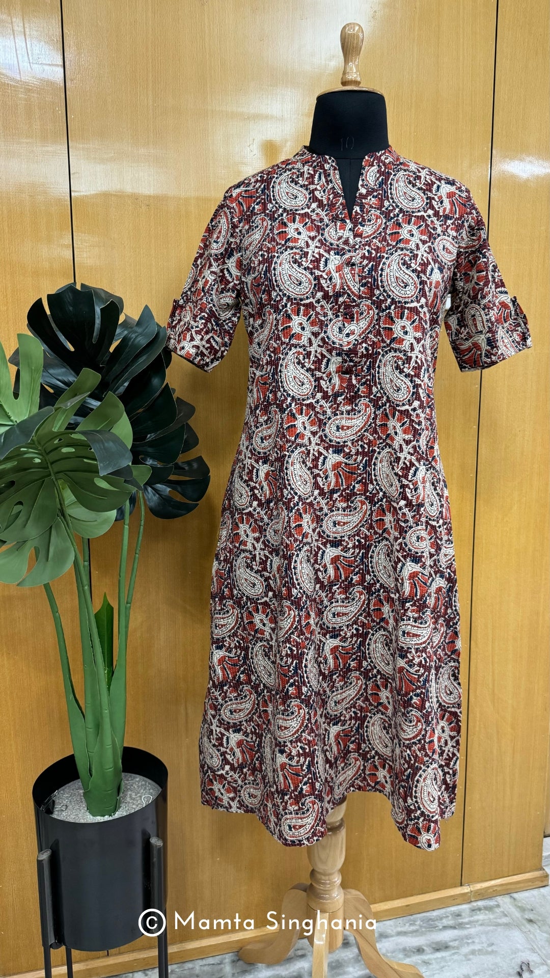 A-line kurti with short sleeves. Detailed with hand-made fabric buttons, these ready-to-wear pieces are very comfortable for daily use.