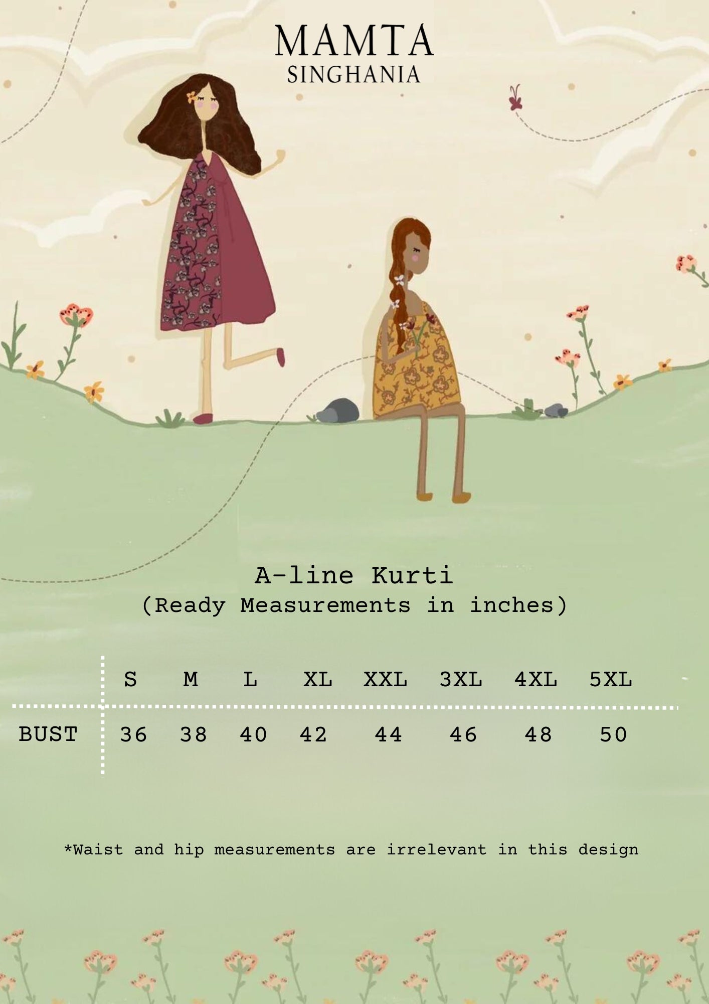 For custom orders, please make sure you share your contact number on the checkout page. We will contact you for your size requirements and make the kurti accordingly.