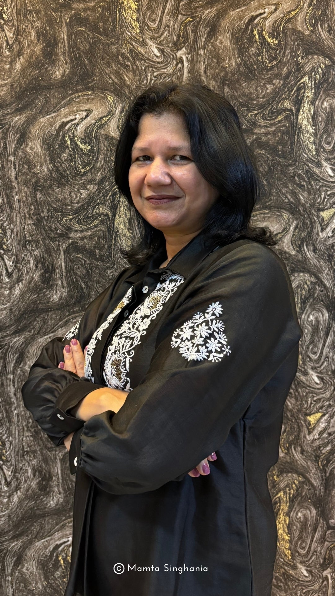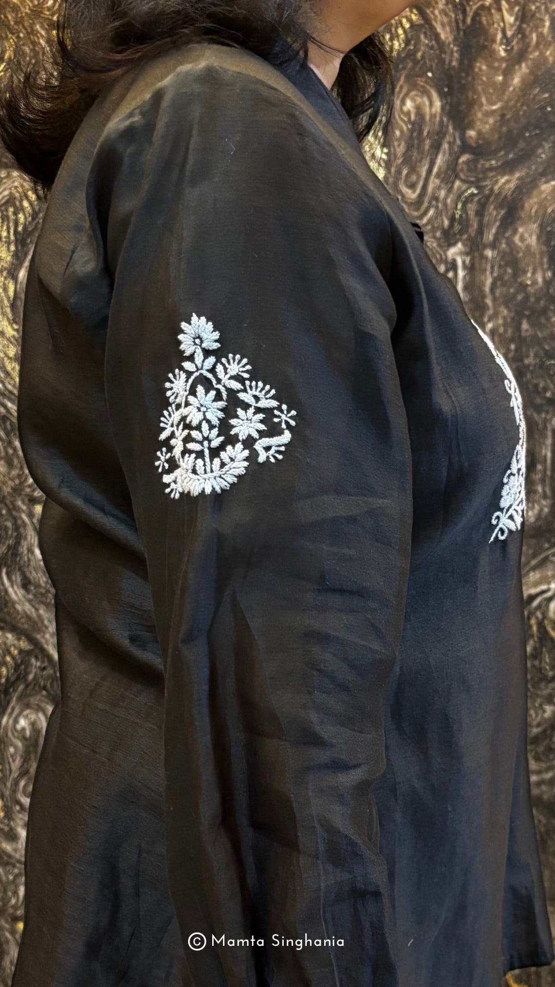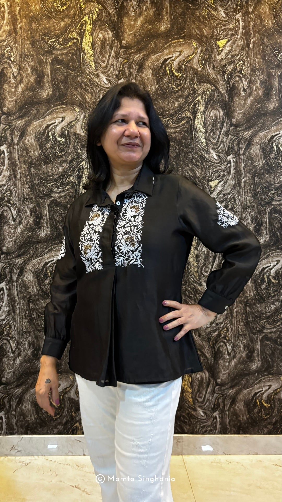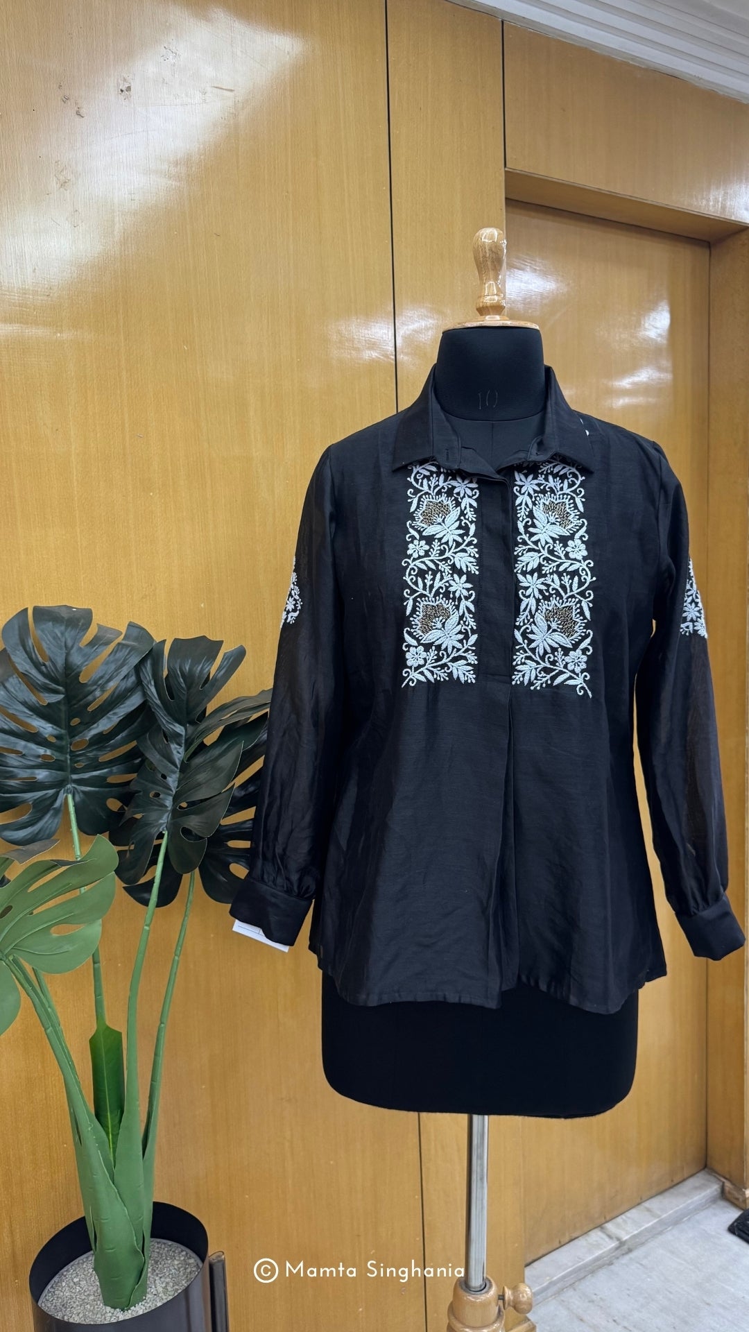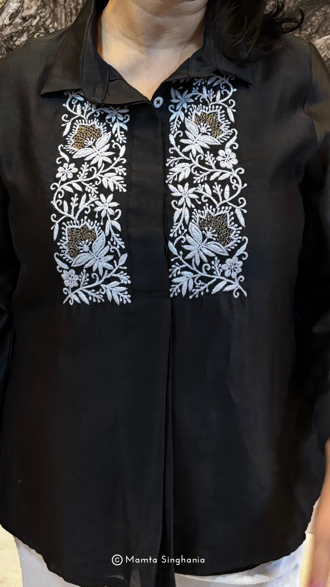 Black top with intricate white thread embroidery.