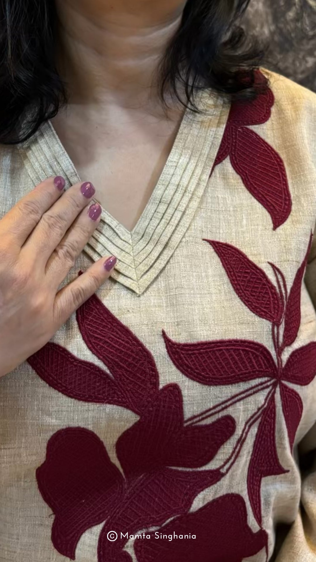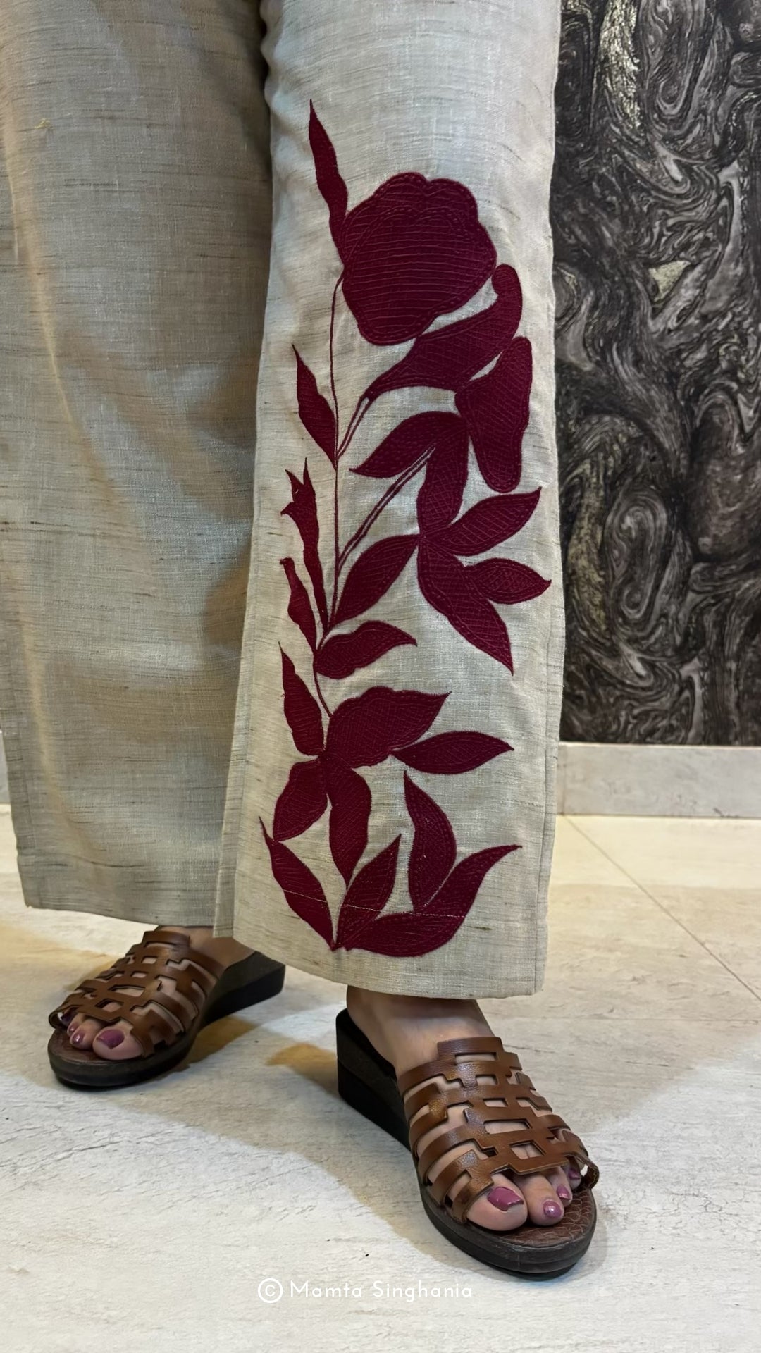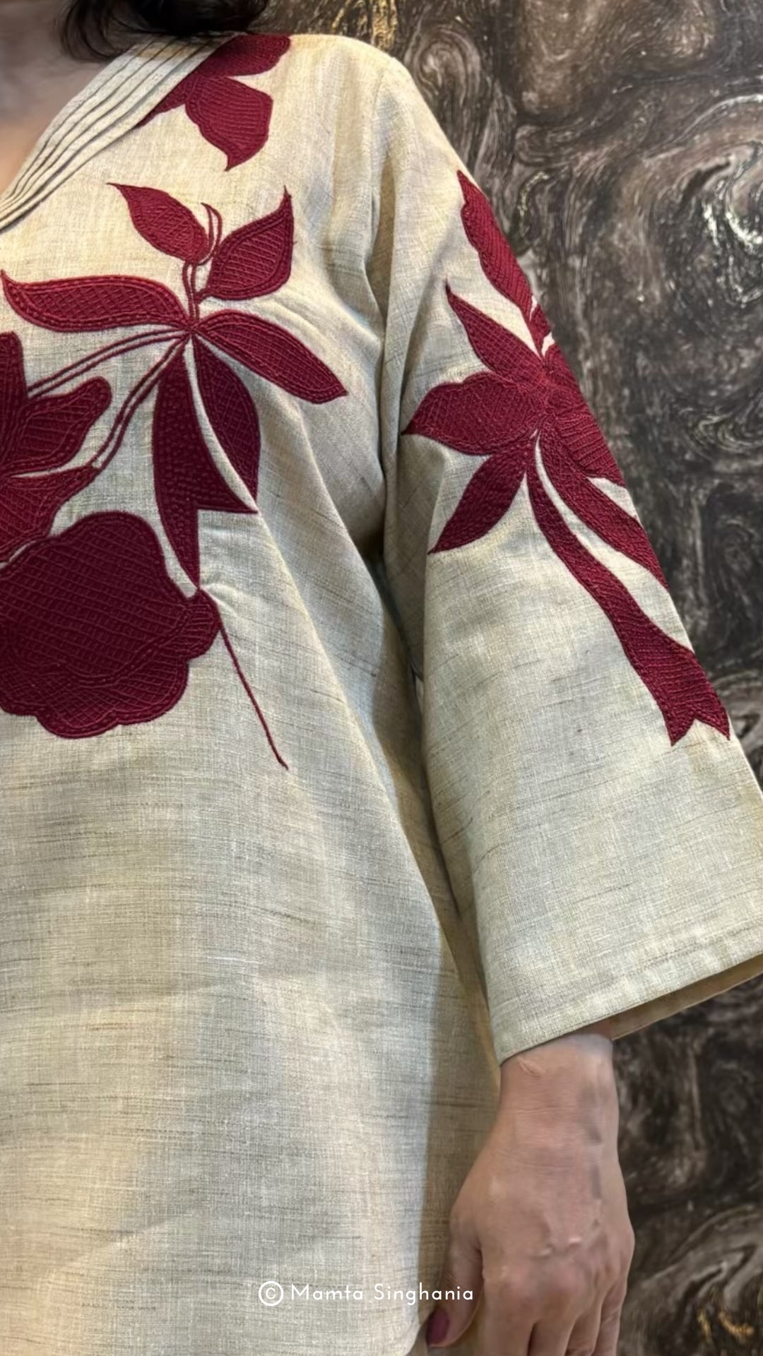 Handloom cotton co-ordinated set with intricate floral appliqué.