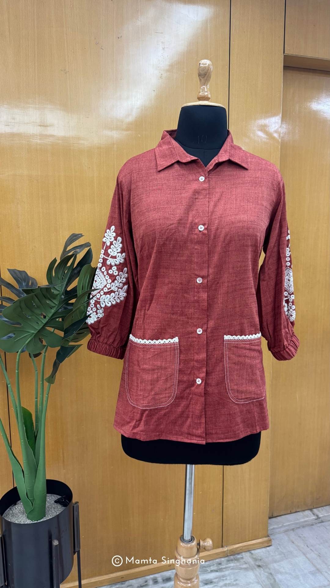 Rust brown top with intricate sleeve embroidery and lace pocket embellishments.