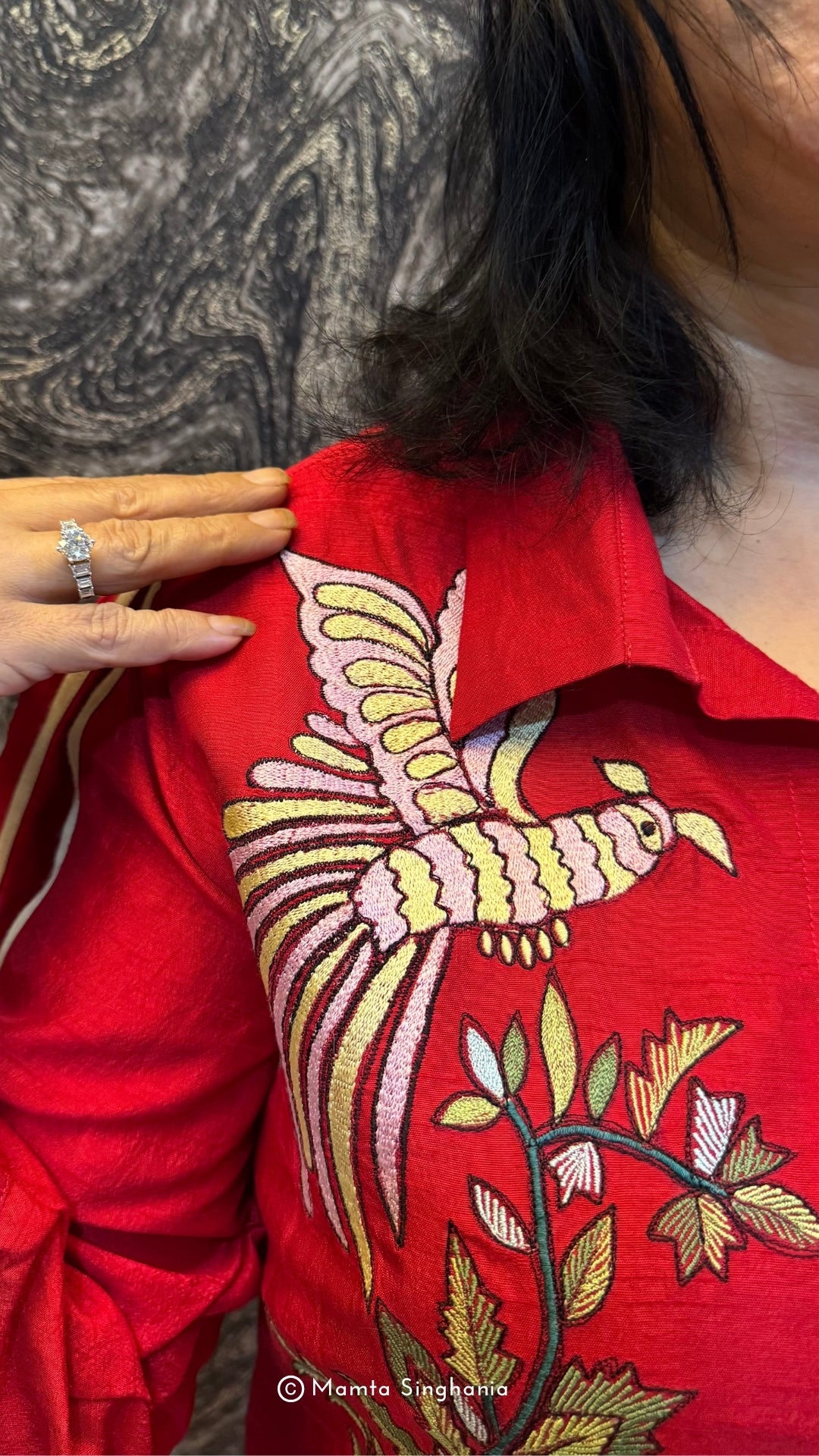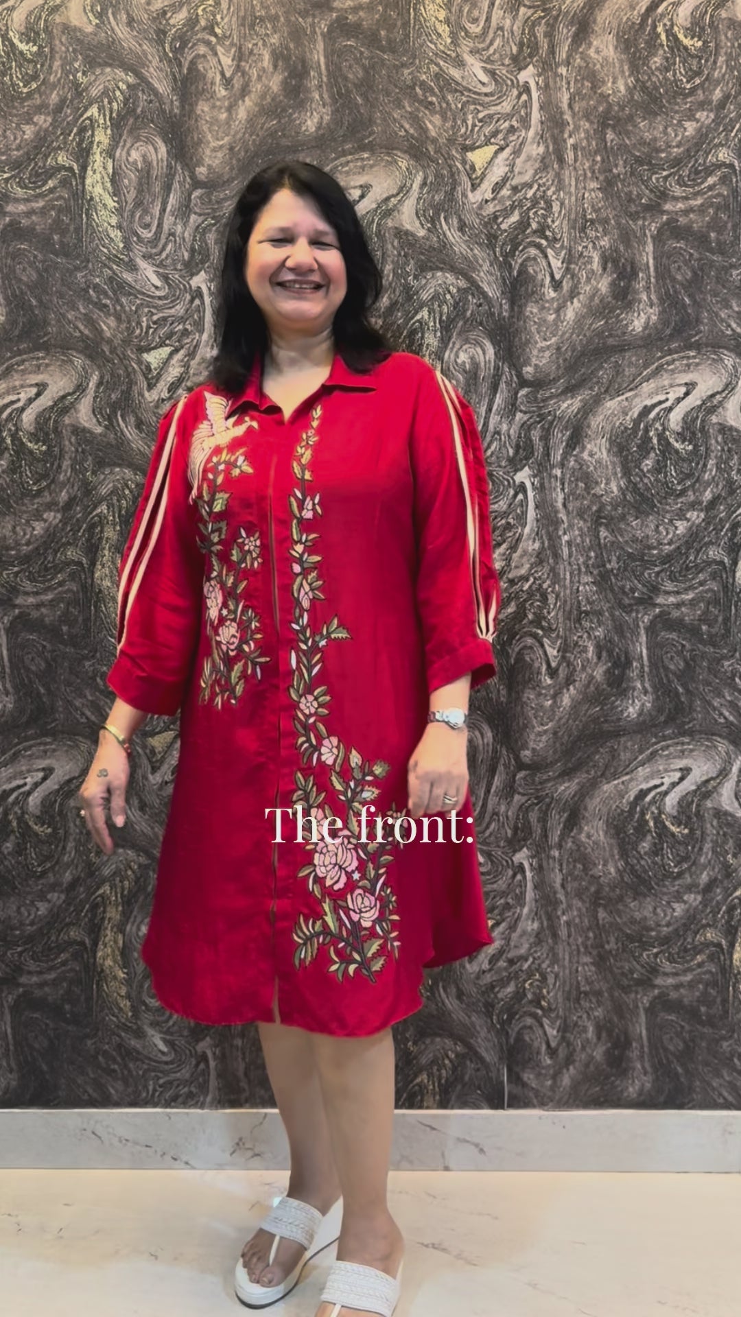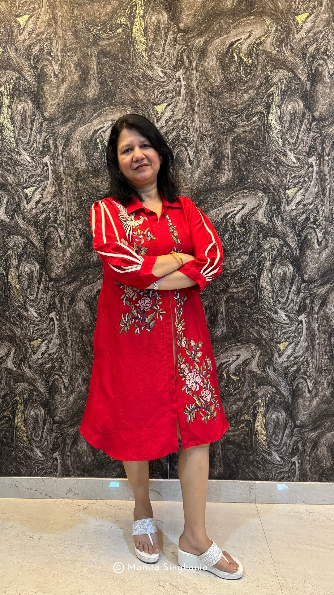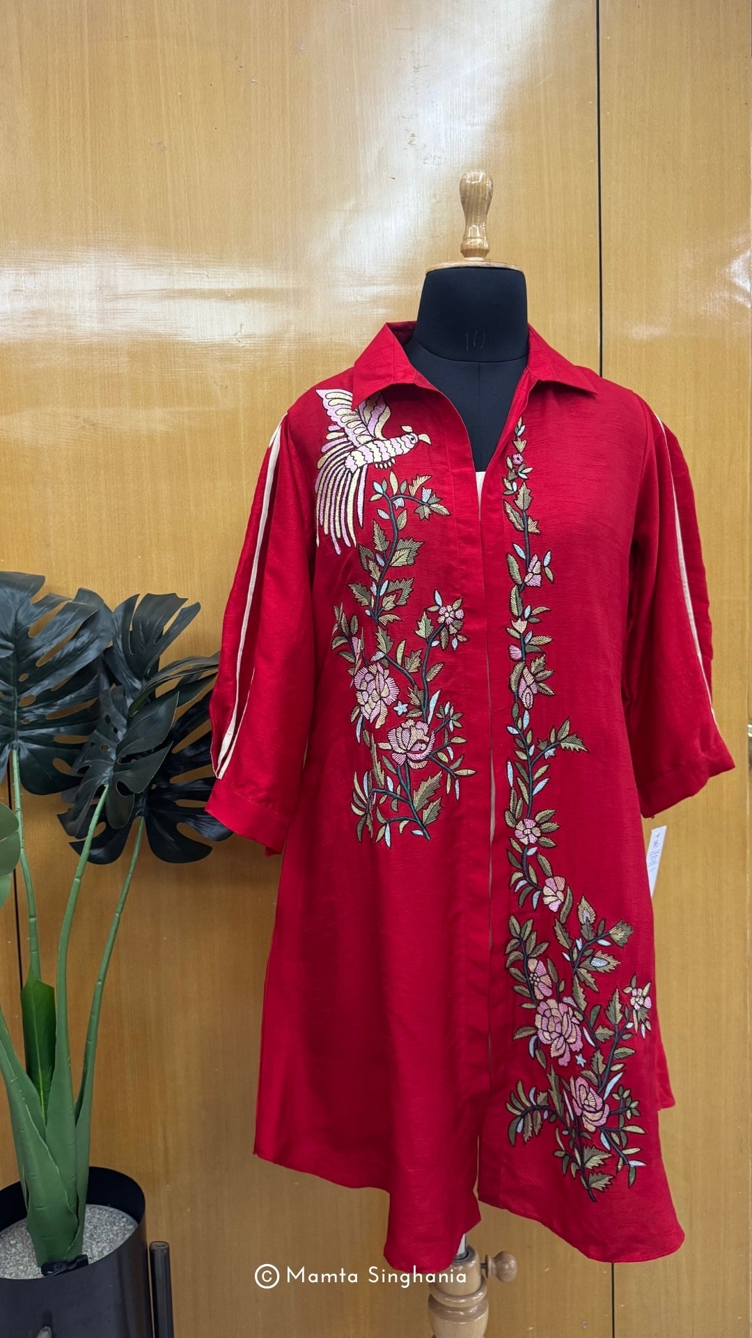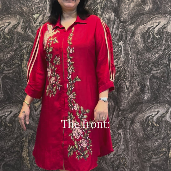 Red A-line embroidered dress with intricate floral embroidery and balloon sleeves with cream colour fabric detailing.